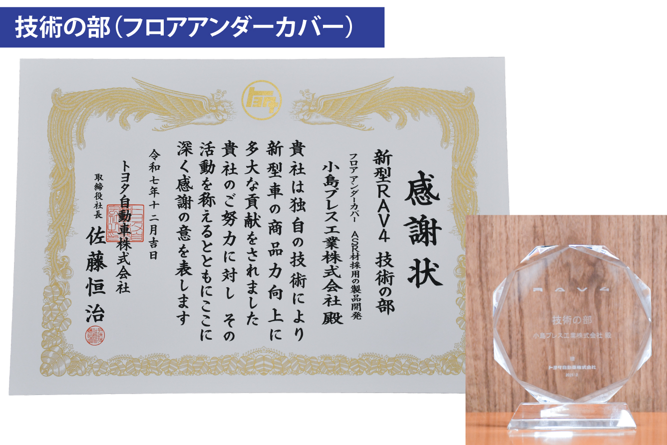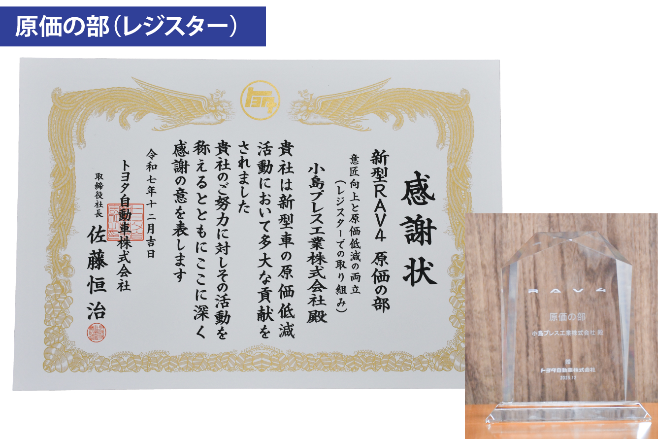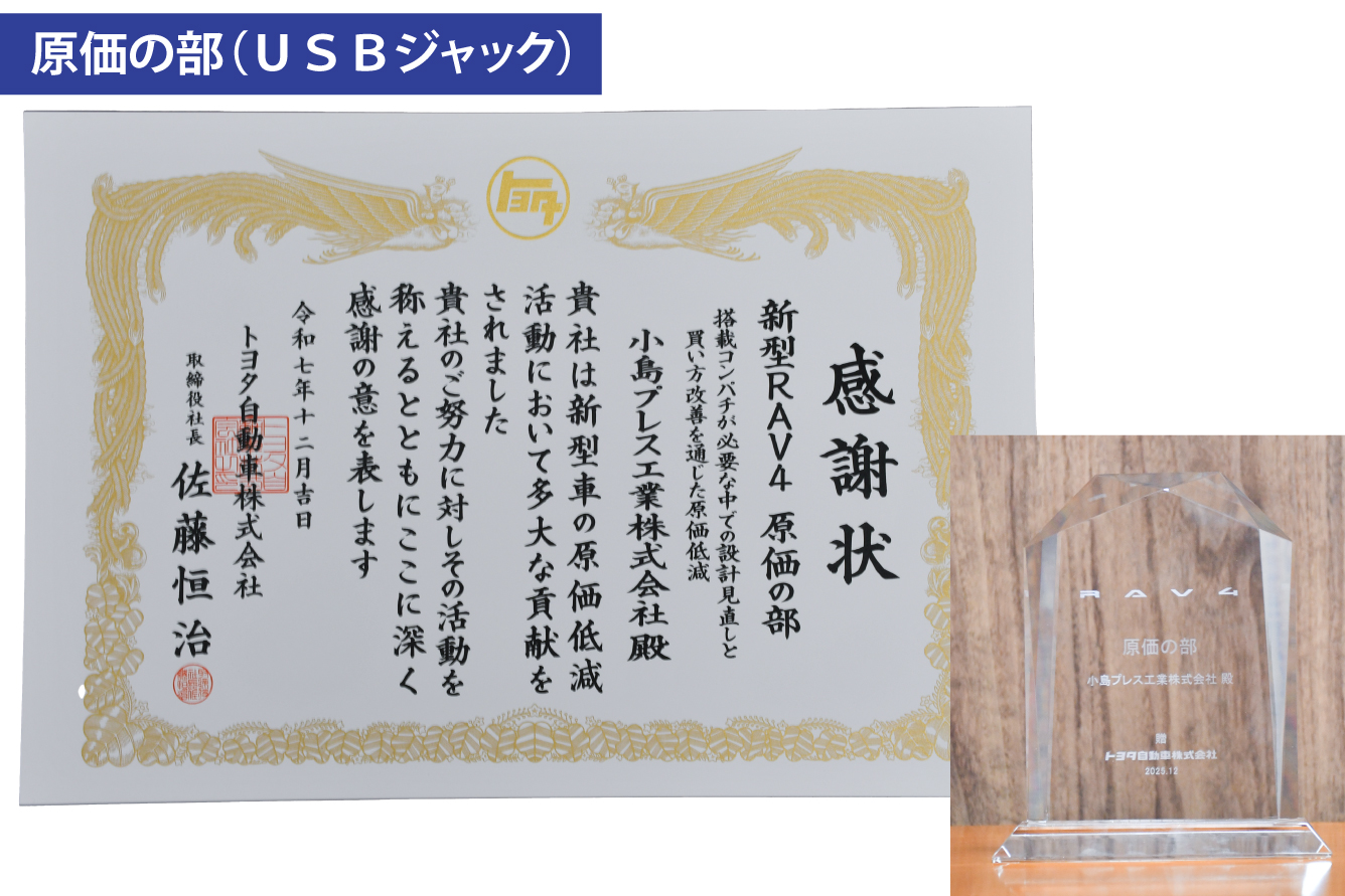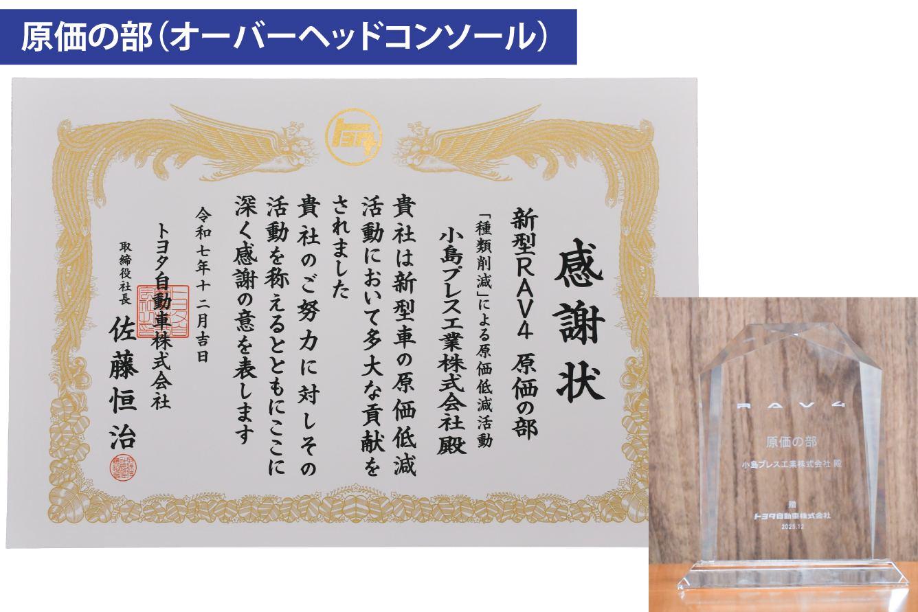 HOME小島プレス工業からのお知らせ小島プレス工業からのお知らせ 2025.12.16 トヨタ自動車㈱様からRAV4プロジェクト表彰を受賞 トヨタ自動車㈱様より、RAV4におけるプロジェクト表彰において、原価の部を3賞、技術の部を1賞受賞しました。 最新のお知らせ一覧に戻る