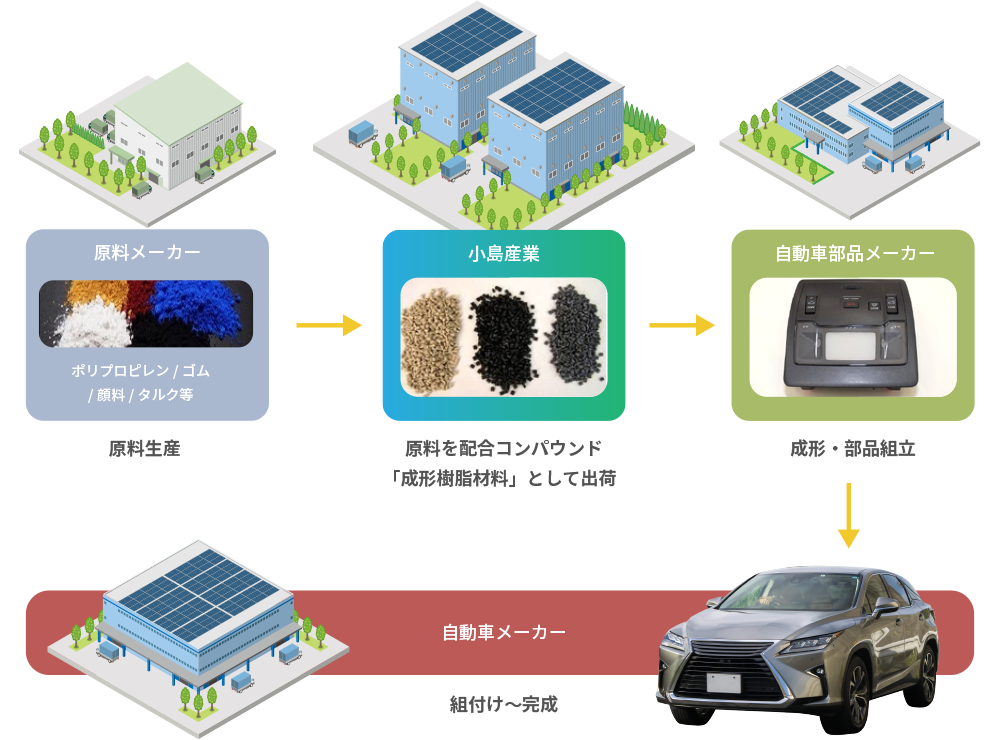 自動車部品用樹脂の販売・加工で培ってきた技術を活かし、色・強度・耐久性などの性能を支える高品質なコンパウンド材を安定して提供しています。