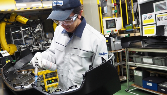 成形、加工、塗装、品質検査、組付け、出荷などの業務に分かれており、安全・品質を意識ししながら日々取り組んでいます。金型を用いてオーバーフェンダーやサイドステップなどの自動車部品を成形するのが主な業務で、成形機を使い材料となる樹脂を型枠に流し入れて成形し、加工した後に品質検査を行います。お客様が求める加工基準を忠実に再現できる生産設備はもちろん、そこに人の感性を活かすことで品質と生産性をより高めています。