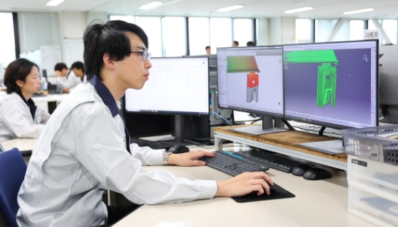 様々なCAE(解析)ソフトを使用し、製品成形時の流動や変形、強度シミュレーションを行うデジタルエンジニアリング部門です。設計が作図した3Dデータを元にCAE上で事前検証することで、出図段階での製品信頼性を裏付けします。また、オペレーションだけでなく、解析精度を上げるための実機トライや検証活動、新たな解析技術の導入も積極的に推進。最近では、製品を車に組付けた後の建付け予測を解析で再現することで、製品精度の向上に繋げています。