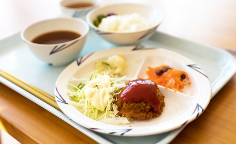 昼食が毎日無料で食べられます。4種類のメニューから好きなものが選べ、夏は冷やし中華、Xmasにはフライドチキンなど季節のメニューも楽しめます。また健康を意識して、各メニューにはカロリー表示を行い、野菜多めのメニューなども用意しています。