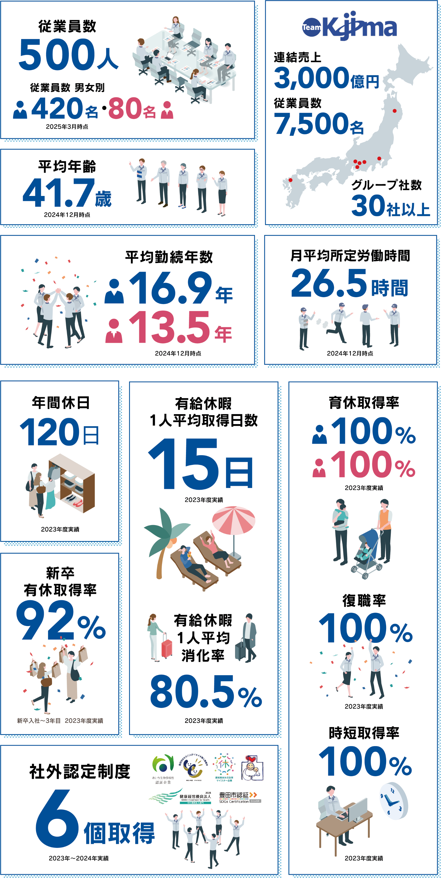 食堂利用及び飲物の無料、Amazonビジネス年間24,000円分費用補助など、社員に好評な制度がたくさんあります。また、育児休業取得率男女100%など、仕事と家庭を両立し安心して働ける環境づくりを目指しています。その取り組みが評価され、表彰や認定を多数受賞。
