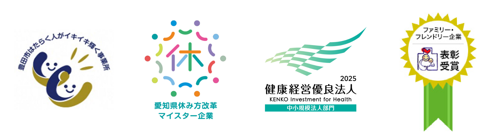 社員の健康増進に取り組む「健康経営優良法人」として認定。また、ワーク・ライフ・バランスの推進や子育て支援などが評価され、「愛知県ファミリー・フレンドリー企業賞」、「令和5年度豊田市はたらく人がイキイキ輝く事業所 大賞」を受賞。